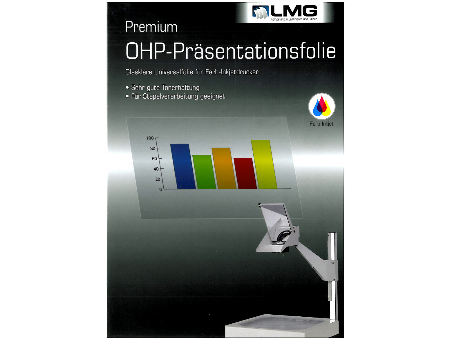 Die einseitige Spezialbeschichtung der glasklaren Inkjetfolien für Overhead-Präsentationen in Farbe ermöglicht eine kurze Trockenzeit und konturscharfe Abbildungen von Farbgrafiken bis zu einer Auflösung von 5760 dpi.