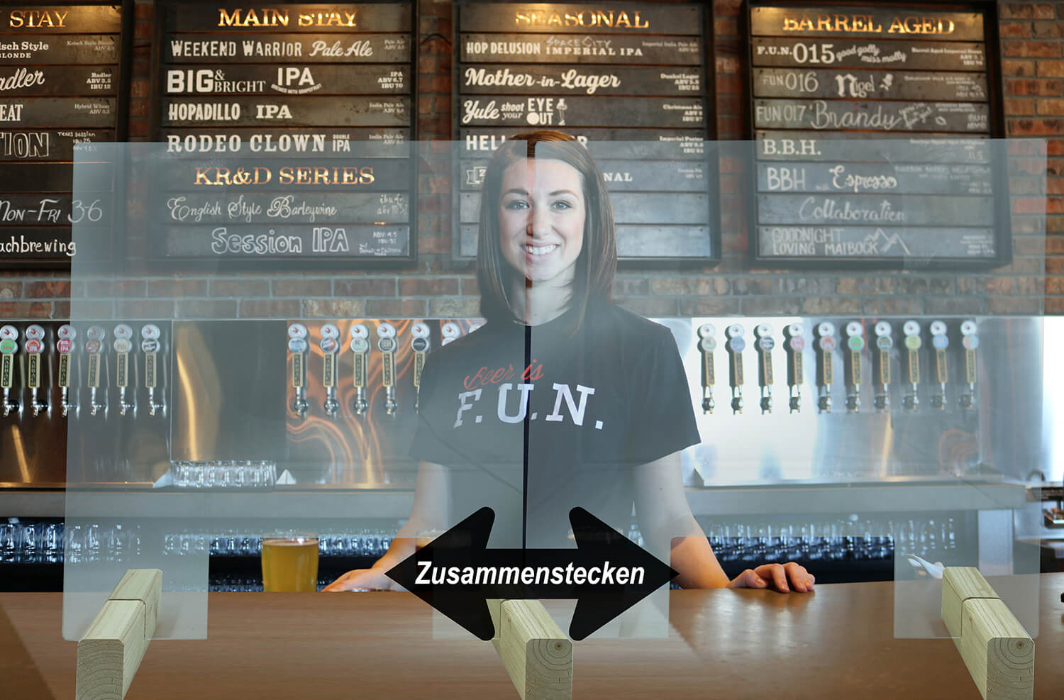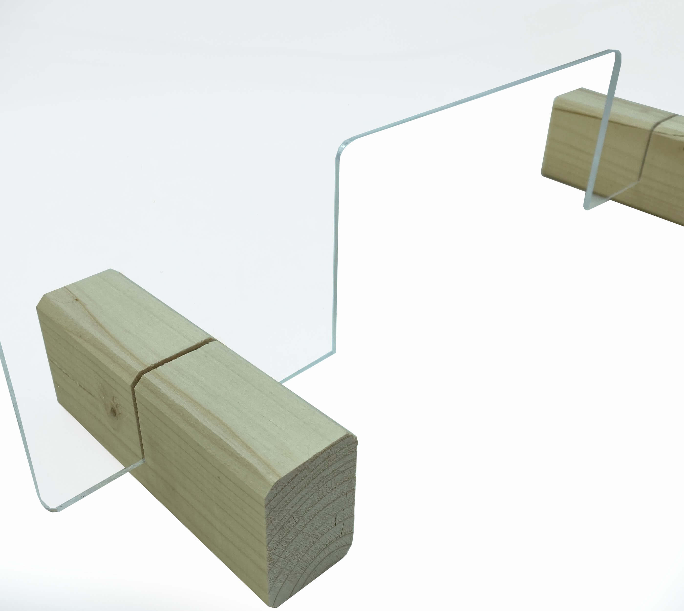 Zu befestigen ist die Schutzscheibe mit 2 hölzernen Standfüßen, welche es erlaubt, 3 Steckmethoden zu verwenden. Wird die Durchreiche nicht benötigt, kann die Scheibe einfach anders herum auf die Vorrichtung gesteckt werden.